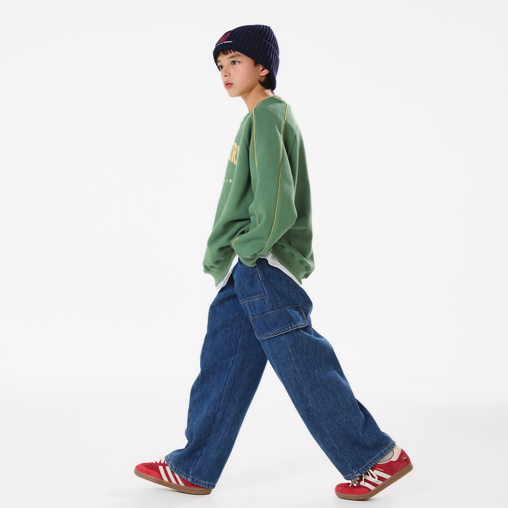 중청 컬러의 탄탄한 원단에 와이드 핏으로 제작되어