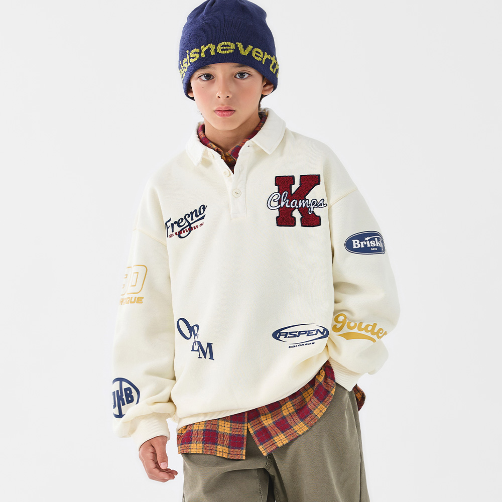 전면에는 큼직한 레터링과 자수 디테일을 배치해