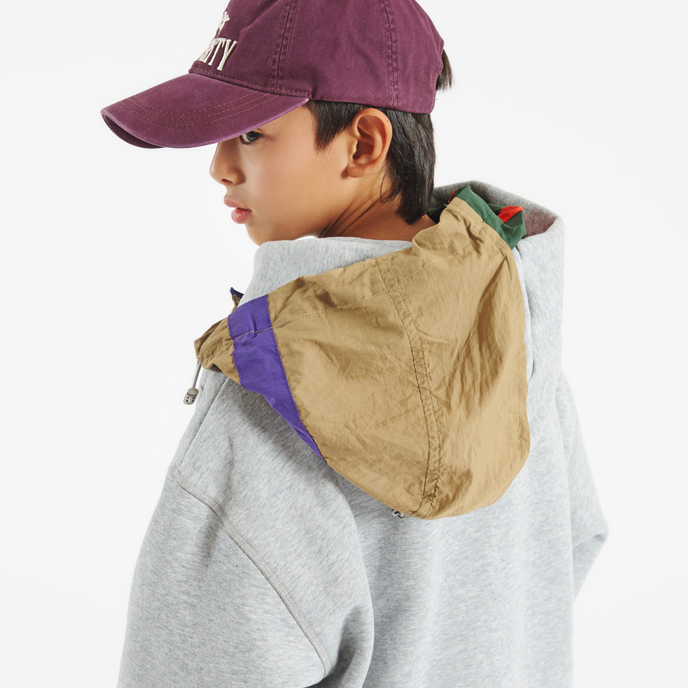 멜란지 컬러 바디에 배색 나일론 후드 패널을 더해 유니크한 포인트를 주었고,