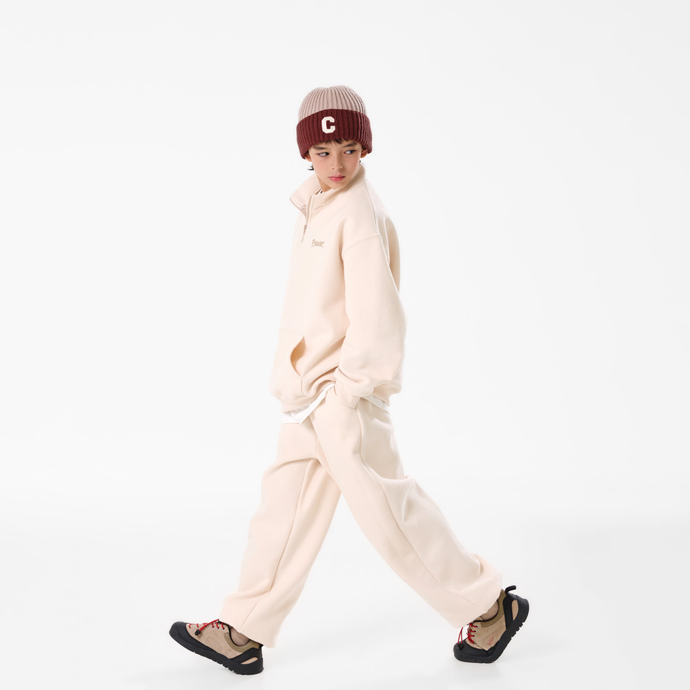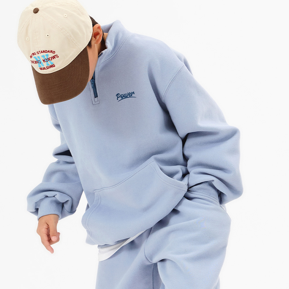 상의는 깔끔한 하프 집업 맨투맨 스타일로,