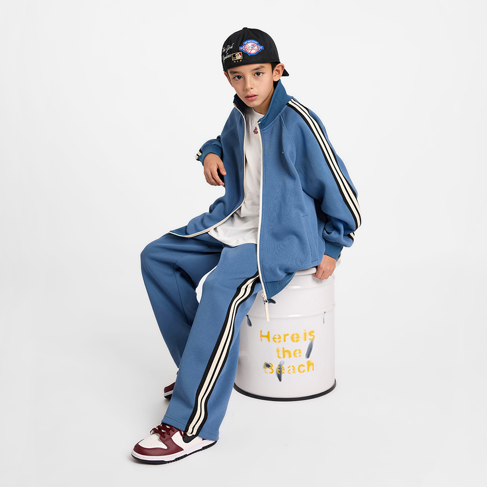사이드 라인 배색 디테일이 스포티한 포인트를 더해주는 집업과 팬츠 구성의 상하 셋업이에요.