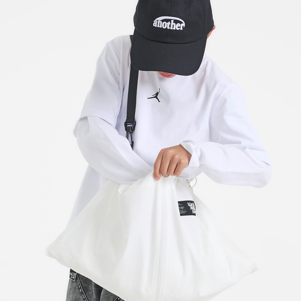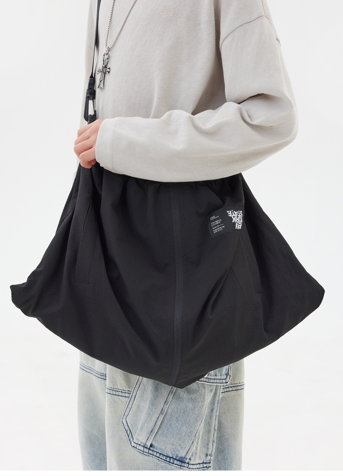 지퍼를 중심으로 접어 끈을 묶으면 숄더백 형태로 변형되어