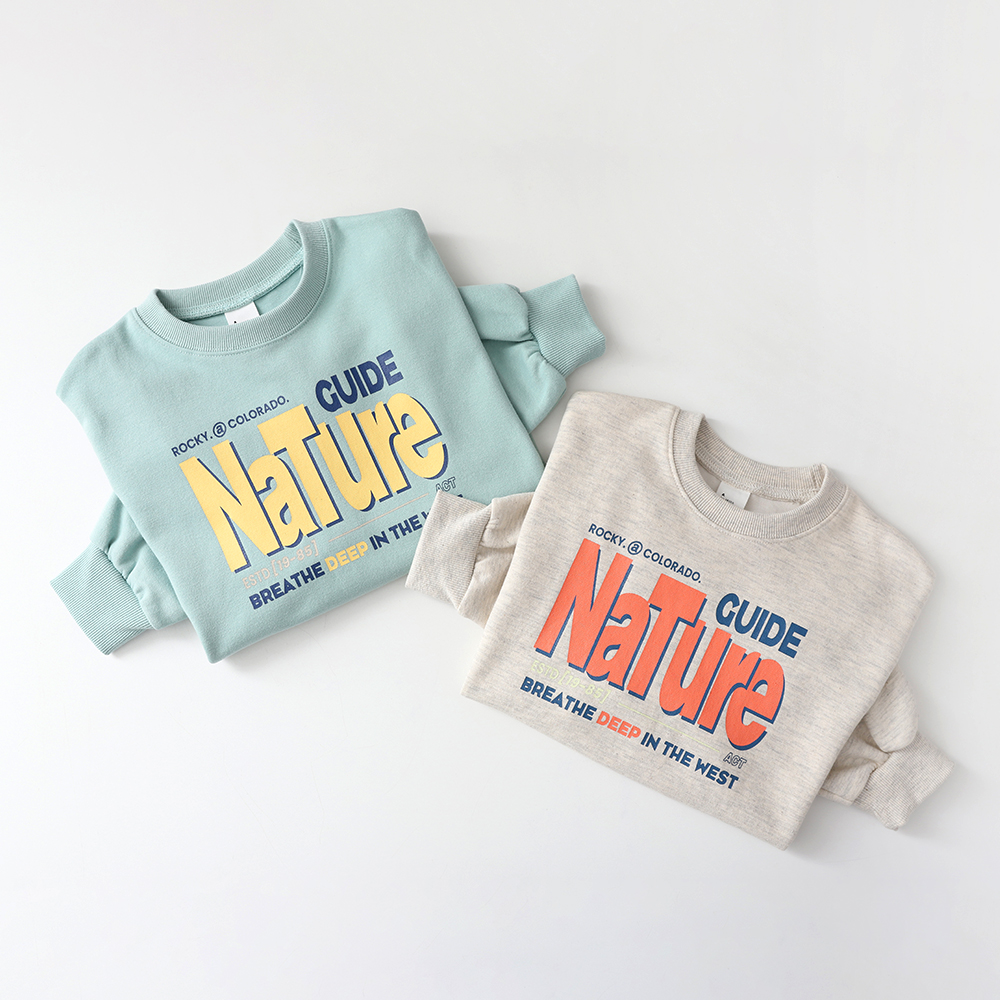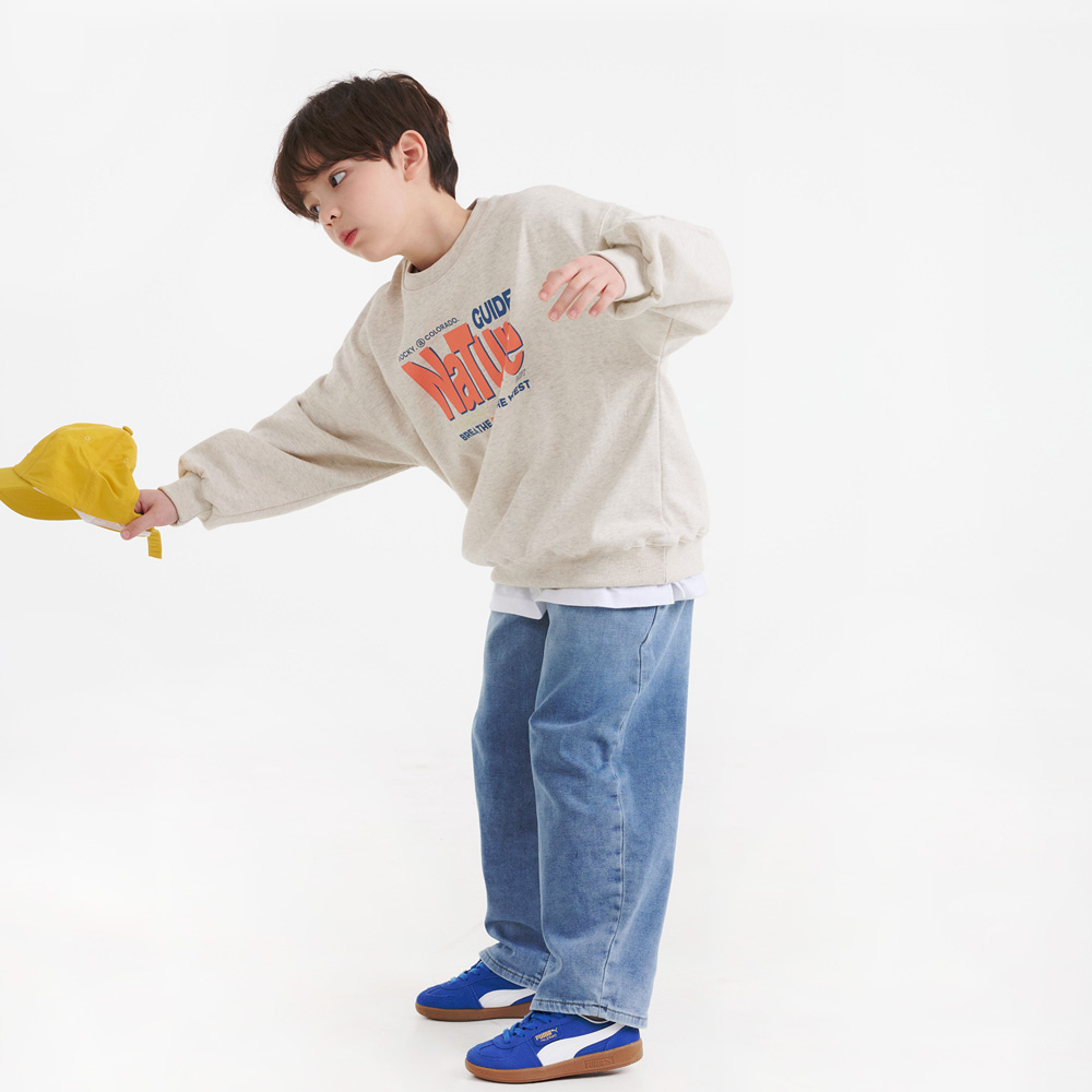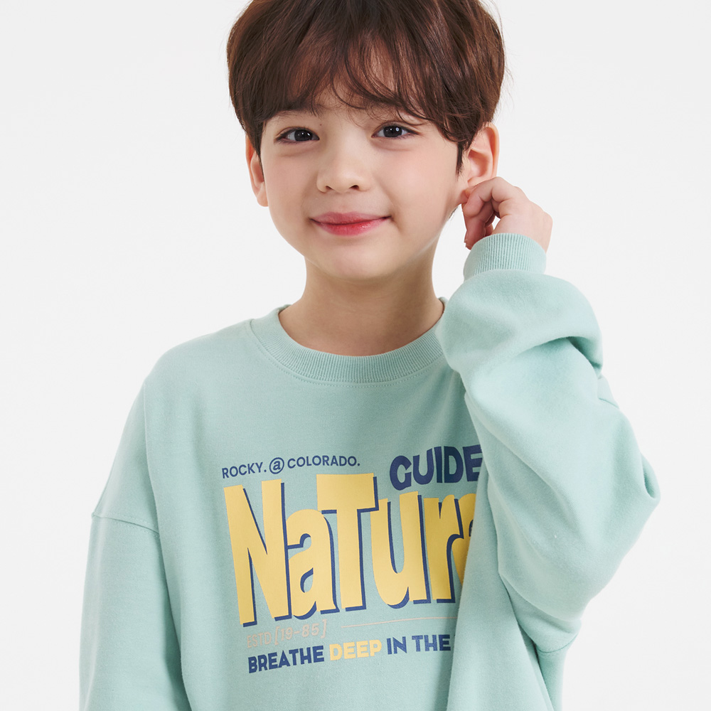 전면 산뜻한 컬러감의 영문 나염이 돋보이는 맨투맨
