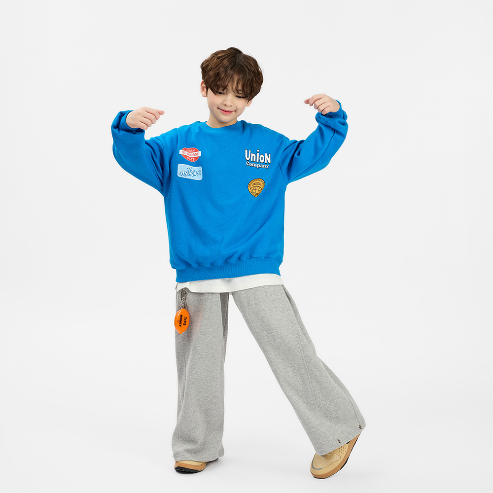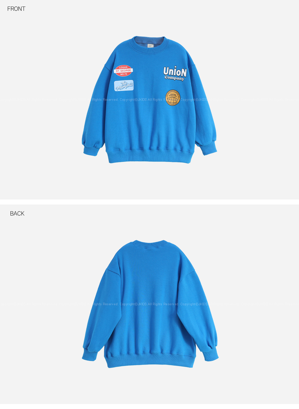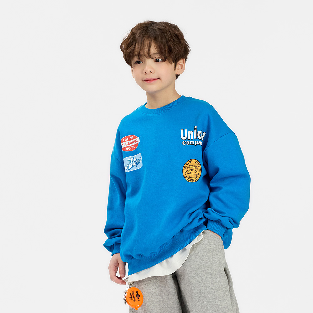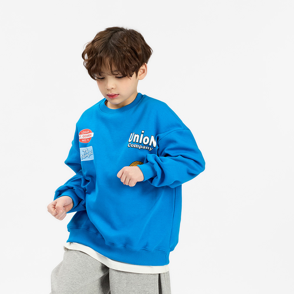 선명한 블루 컬러에 패치 프린팅 포인트를 더해 경쾌한 분위기가 살아 있는 맨투맨이에요.