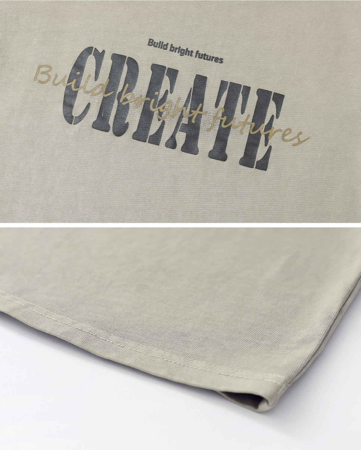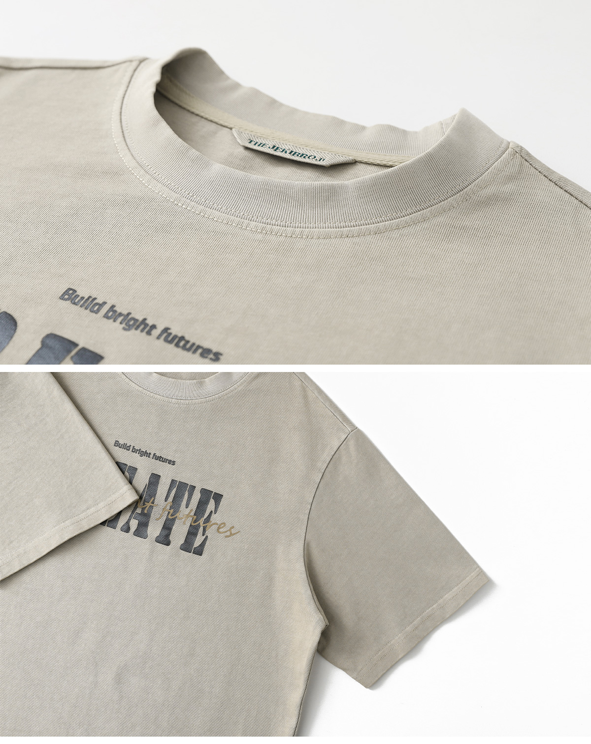 부드러운 베이지 컬러에 빈티지한 레터링 프린팅이 더해진 반소매 티셔츠예요.