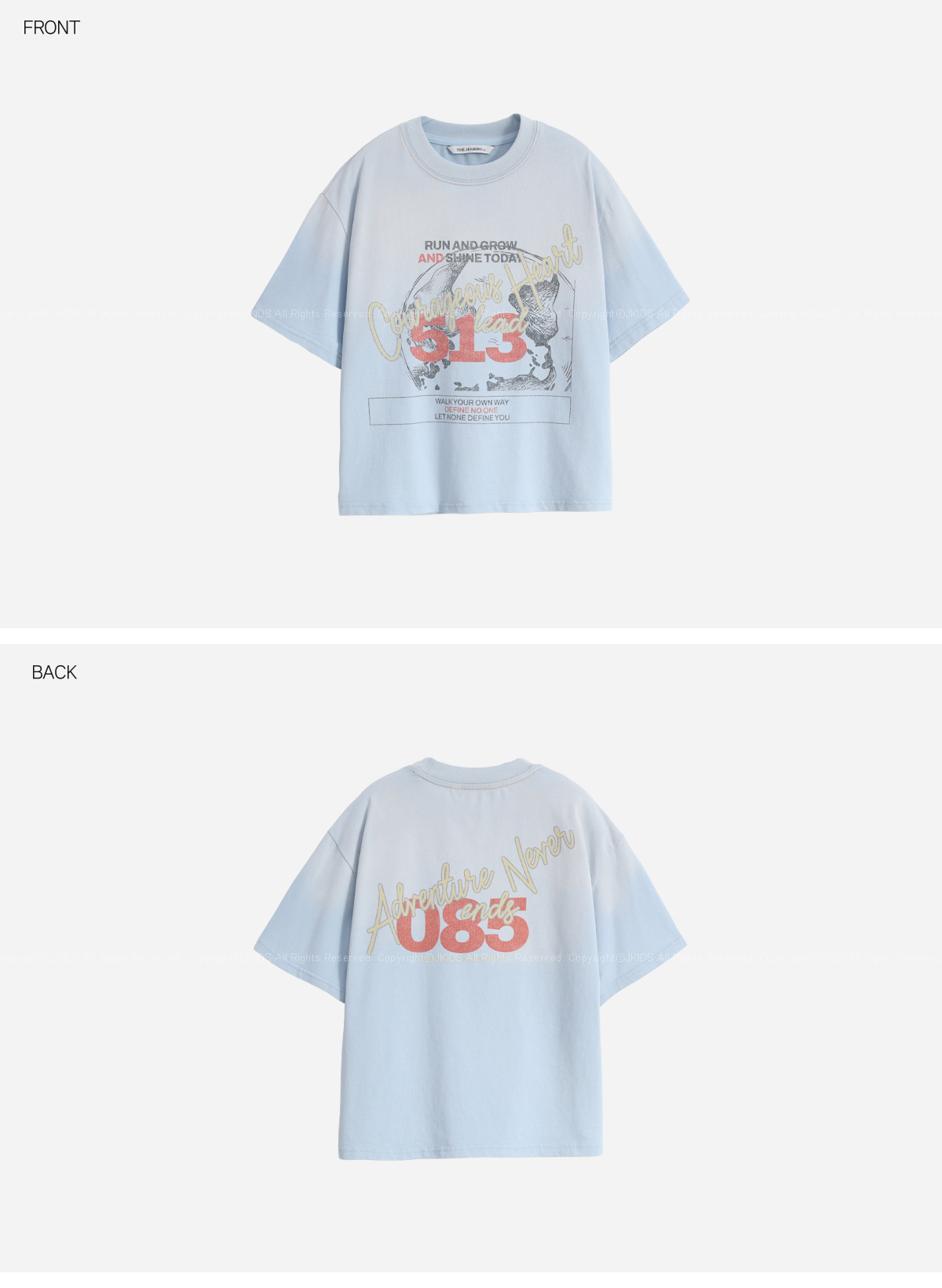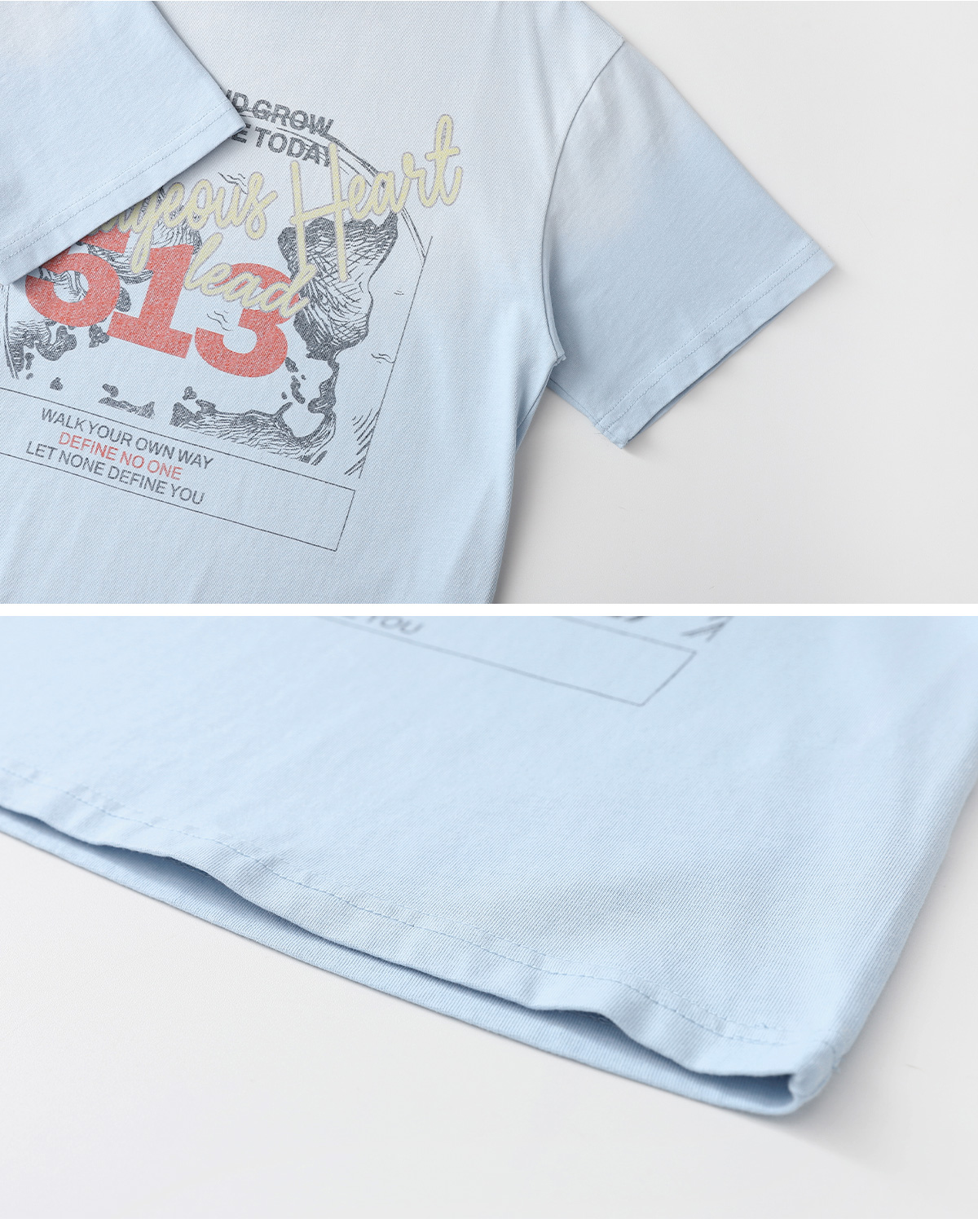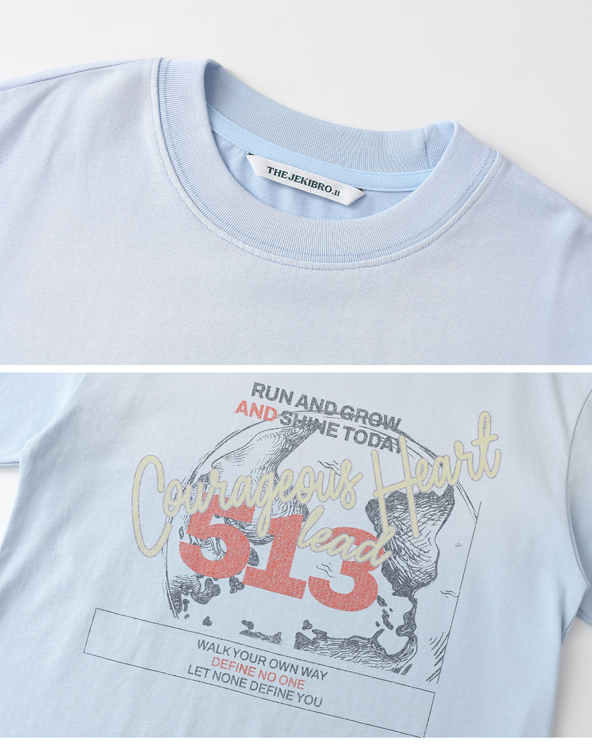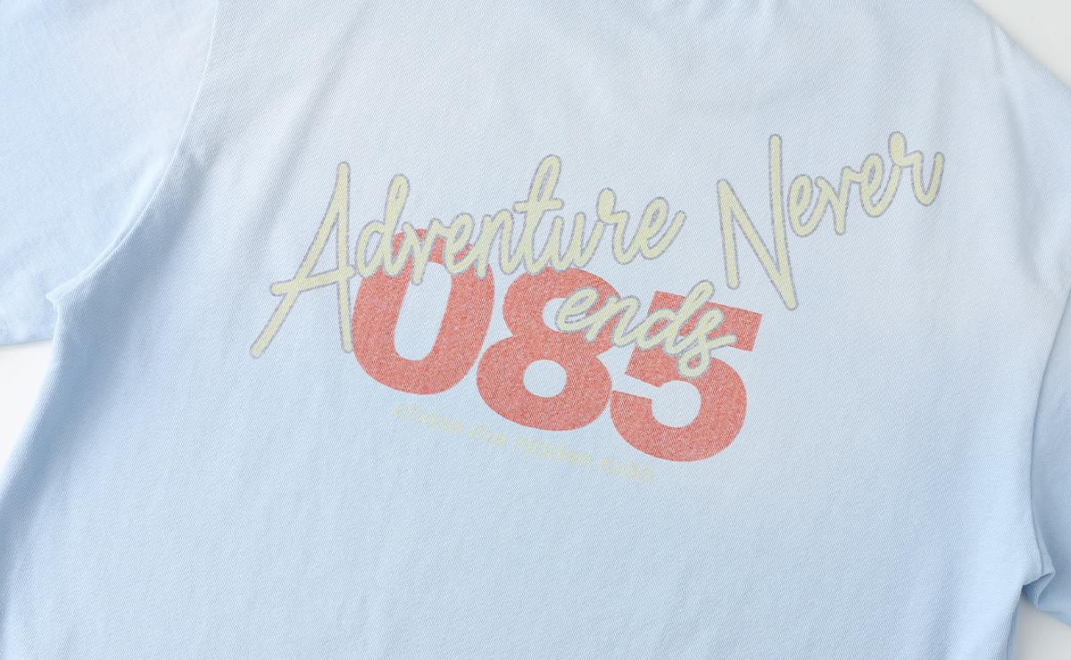 산뜻한 스카이 컬러에 감각적인 레터링과 그래픽 프린팅이 더해져