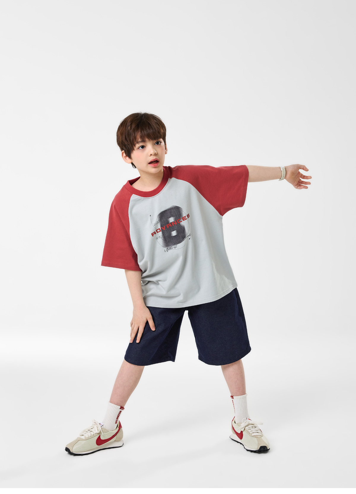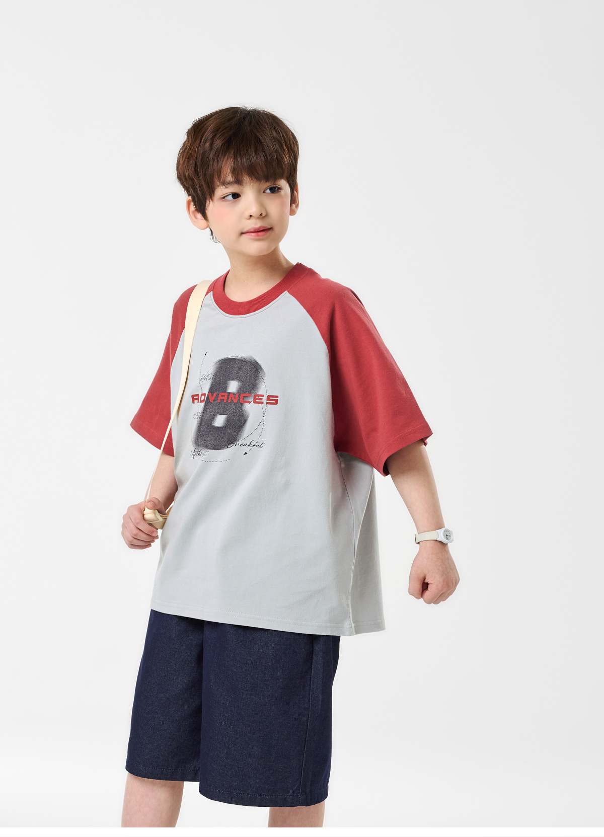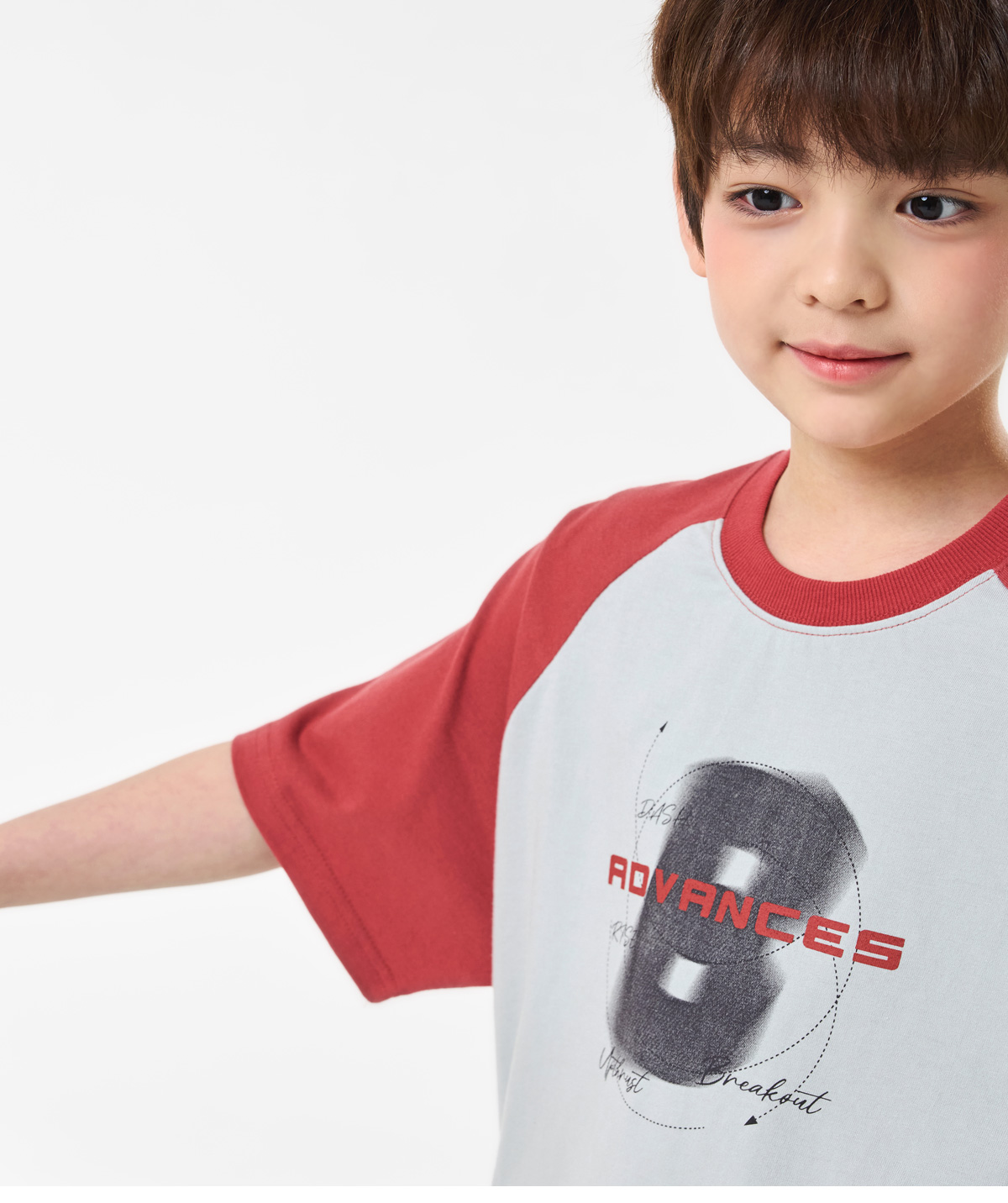 배색 래글런 소매와 프론트 프린팅이 포인트인 쿨그레이 티셔츠예요.