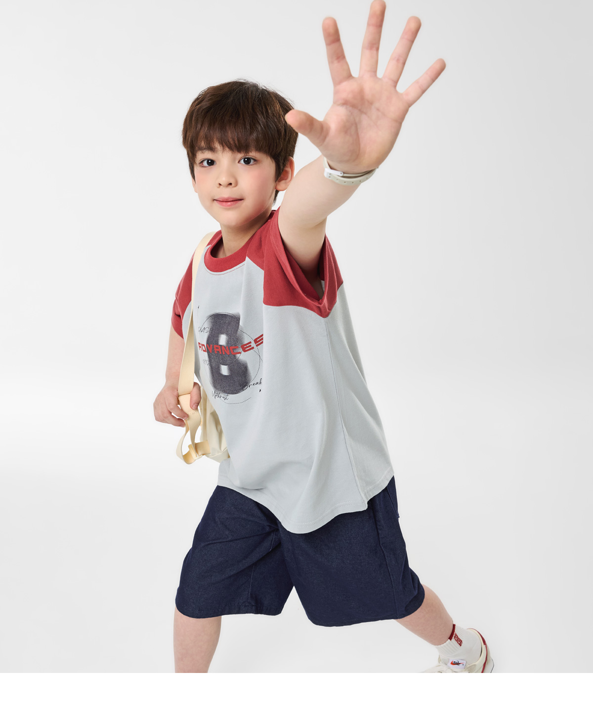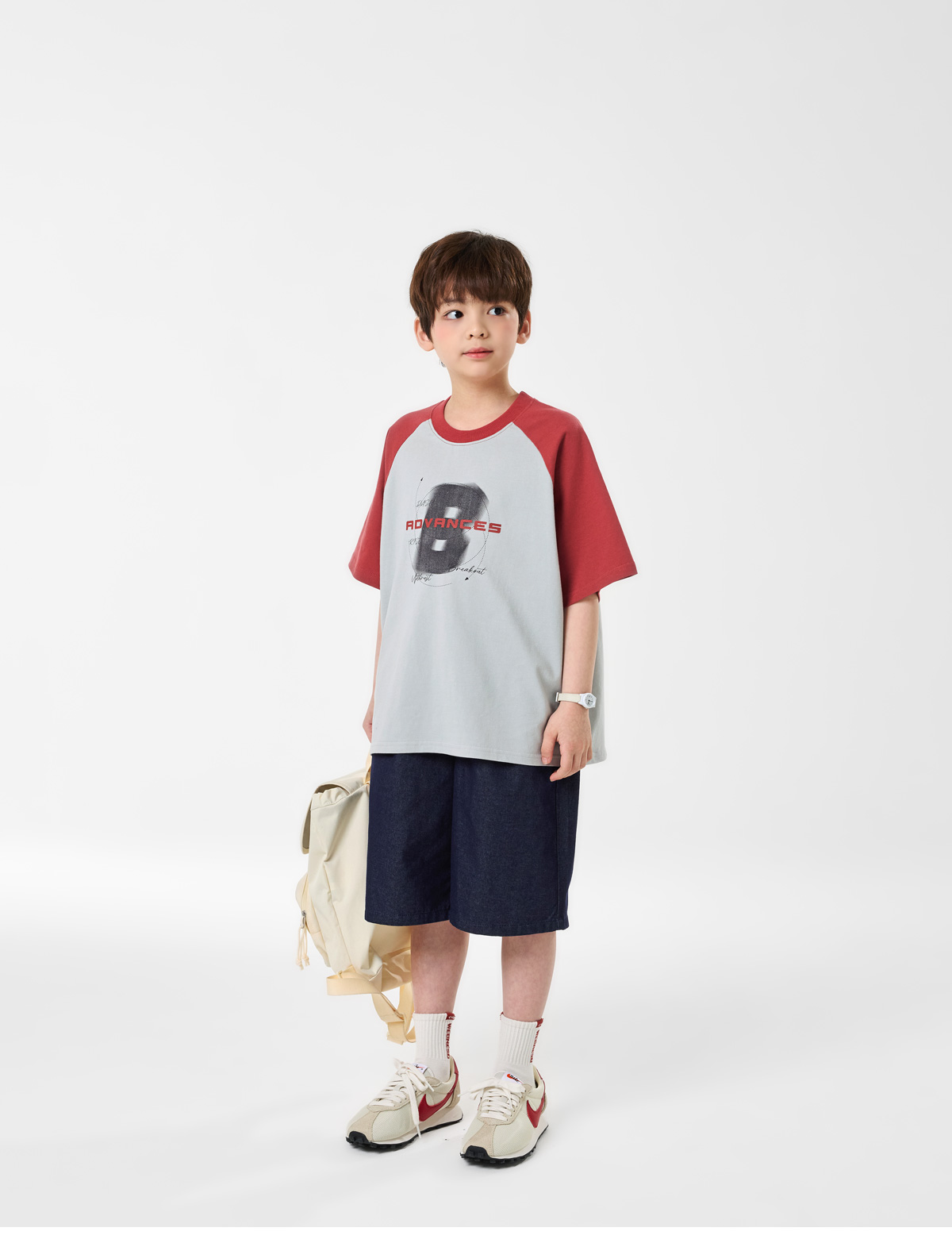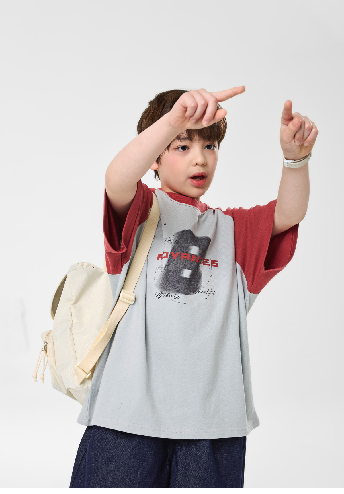 배색 래글런 소매와 프론트 프린팅이 포인트인 쿨그레이 티셔츠예요.