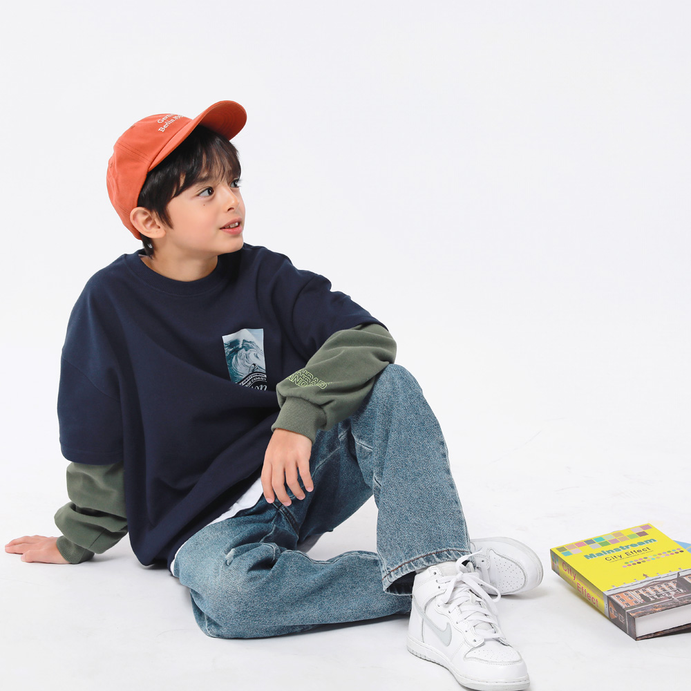 선명한 프린팅으로 포인트를 준 네이비 반소매 티셔츠에 카키 긴소매 티셔츠를 레이어드한듯 하나만으로 멋스러운 코디가 가능한 티셔츠예요