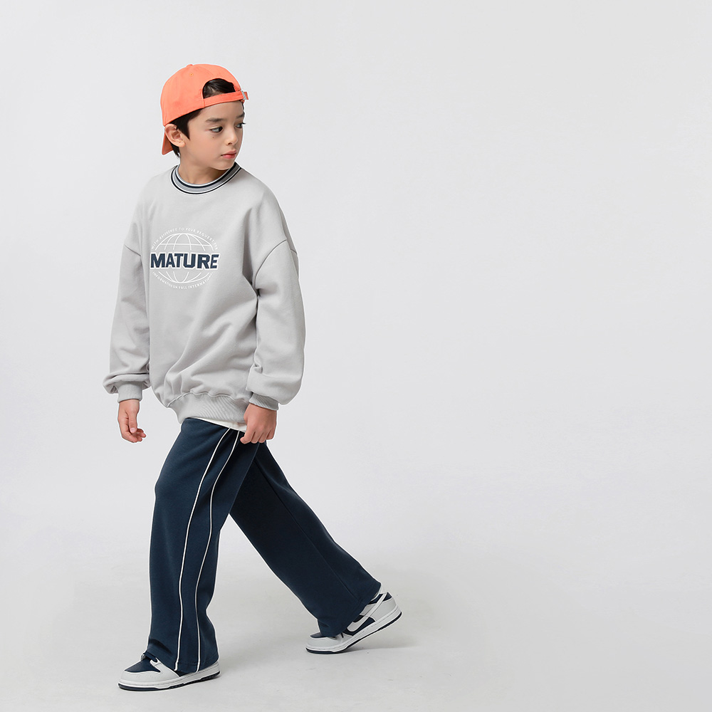 프린팅으로 포인트를 준 맨투맨과 파이핑라인으로 사이드에 포인트를 준 팬츠 구성의 상하셋업이에요