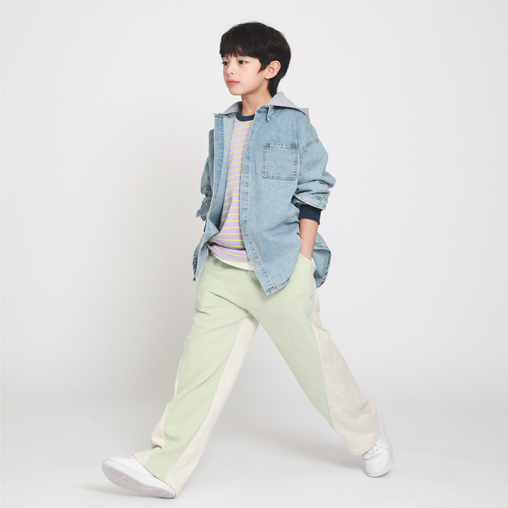 사이드에서부터 사선으로 배색 포인트를 준 팬츠예요 은은한 파스텔톤으로 발랄하게 코디하기 좋아요 은사자수로 포인트를 더해주었답니다