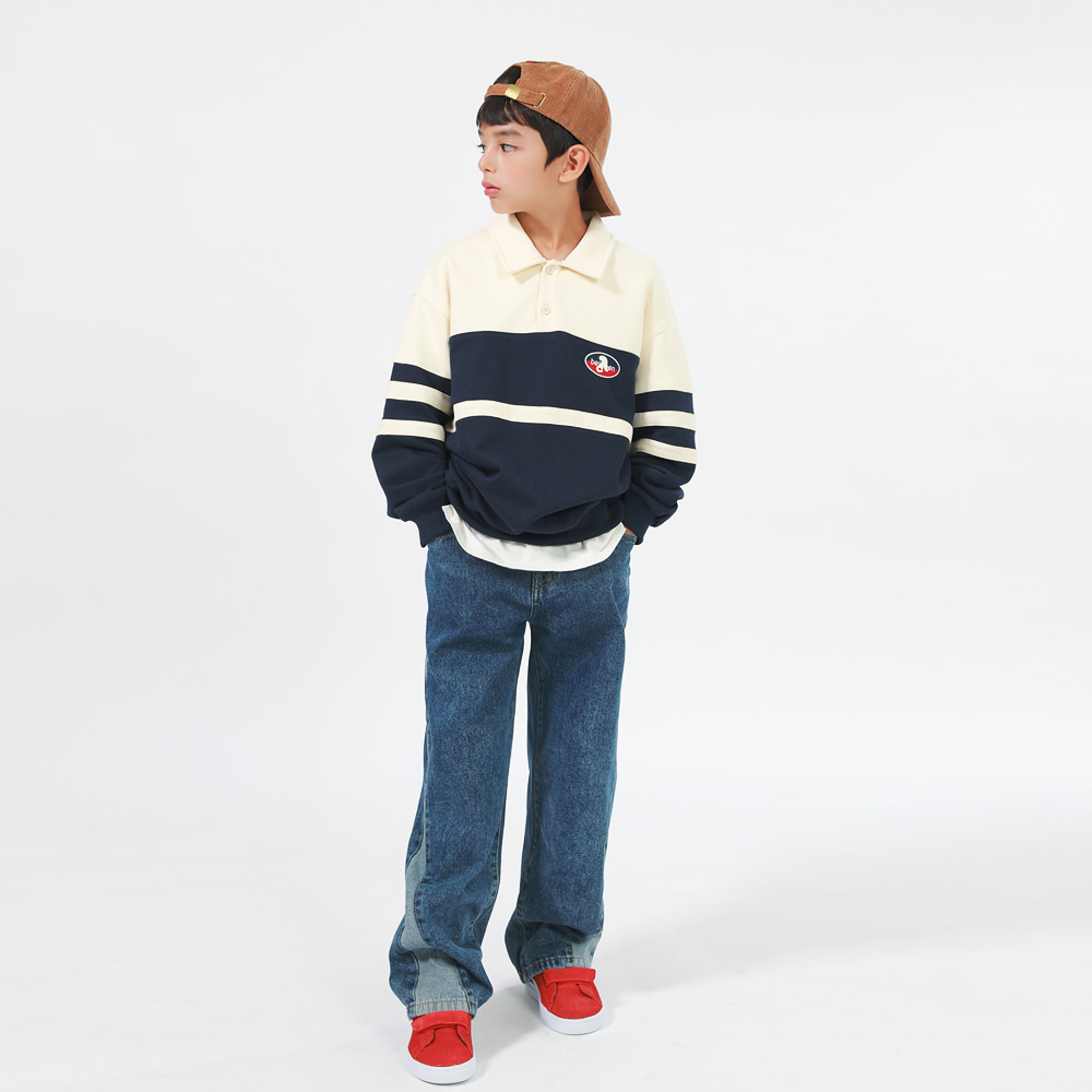 깔끔한 배색 라인과 자수로고가 돋보이는 카라 맨투맨 데일리하게 다양한 하의와 연출하기 좋아요