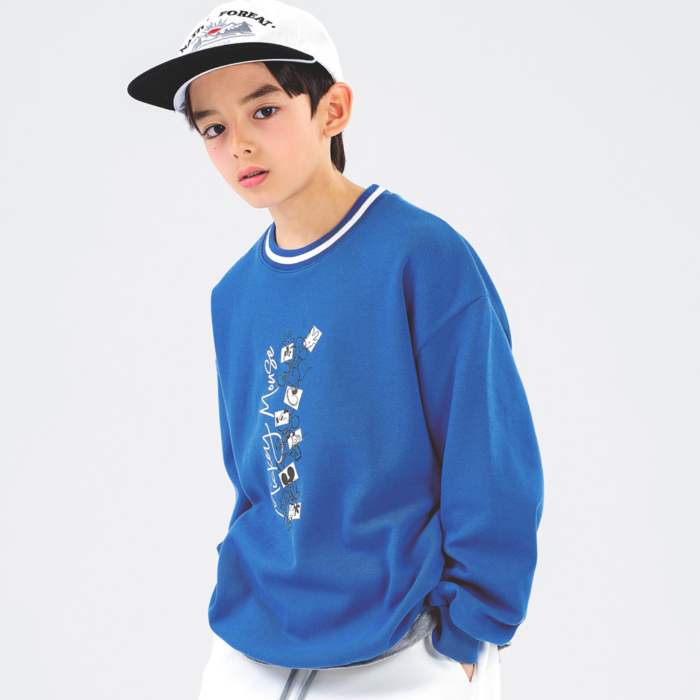 미키마우스가 그려진 깜찍한 맨투맨이에요 블러 컬러 바탕에 화이트 배색으로 깔끔하게 코디하기 좋아요